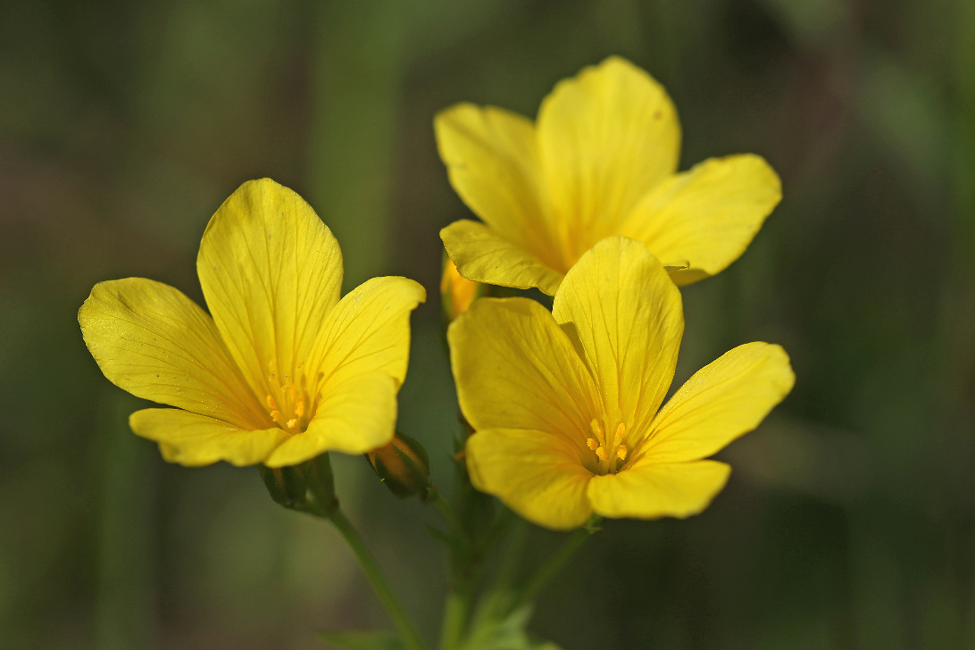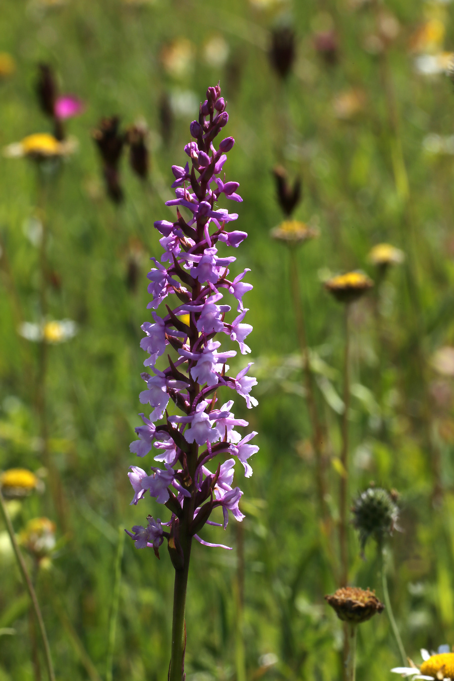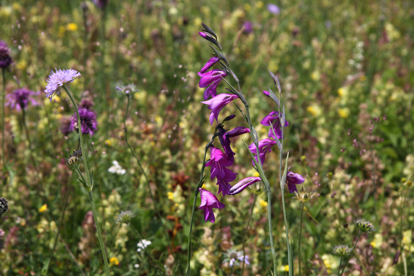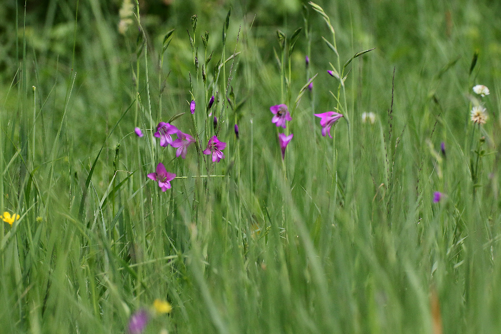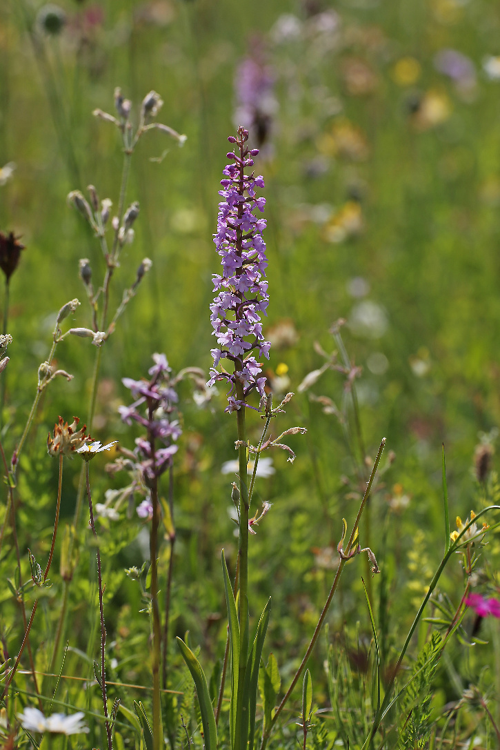 Überrascht hat uns der blaue Dauerlein (Linum perenne) und der klebrige Lein (Linum viscosum), der rosa blüht. Nicht zu übersehen ist das satte Gelb des Ochsenauges (Buphtalmum salicifolium, der Färberkamille (Anthemis tinctoria) und des Hornklees (Lotus corniculatus), während das Sonnenröschen (Helianthemum nummularium) erst in einzelnen Exemplaren zu finden ist. Besonders gefreut haben wir uns über die erfolgreiche Ansiedlung einer heimischen Orchidee, der großen Händelwurz (Gymnadenia conopsea), des Sumpfherzblattes (Parnassia palustris) sowie des Kreuzenzians (Gentiana cruciata) und des Deutschen Enzians (Gentianella germanica), der im Herbst blüht. Die Taubenskabiose (Scabiosa columbaria) sollte man nicht der Wiesenwitwenblume (Knautia arvensis) oder dem Teufelsabbiß (Succisa pratensis) verwechseln, obwohl alle in einem schönen Blau blühen. Die gelbe Skabiose (Scabiosa ochroleuca) hat sich schon gut verbreitet.