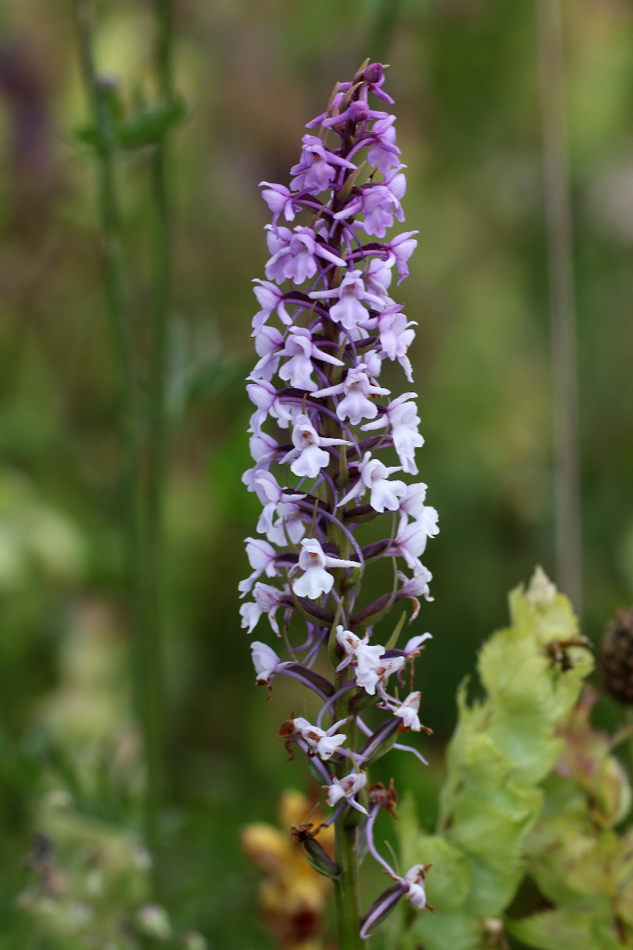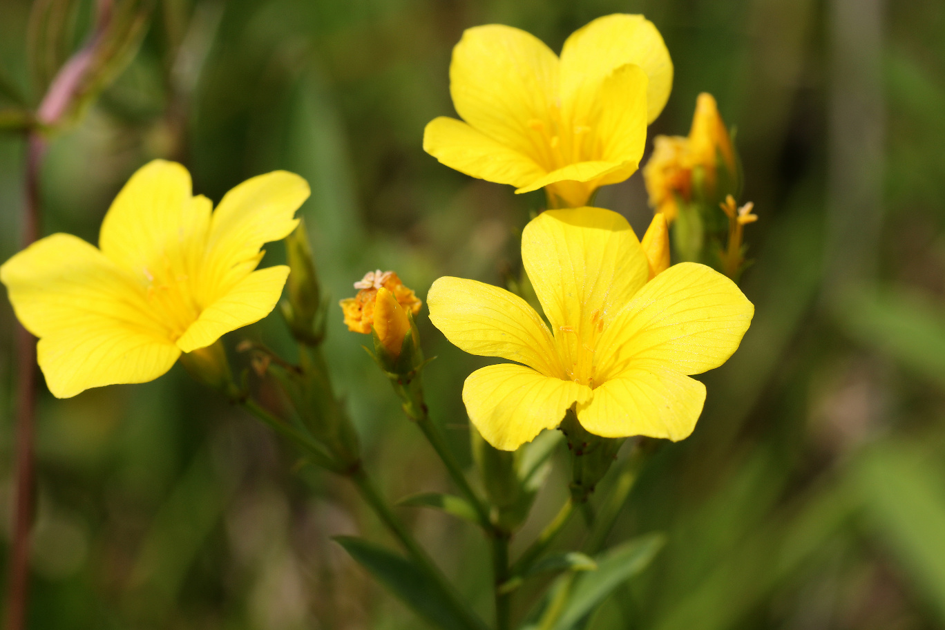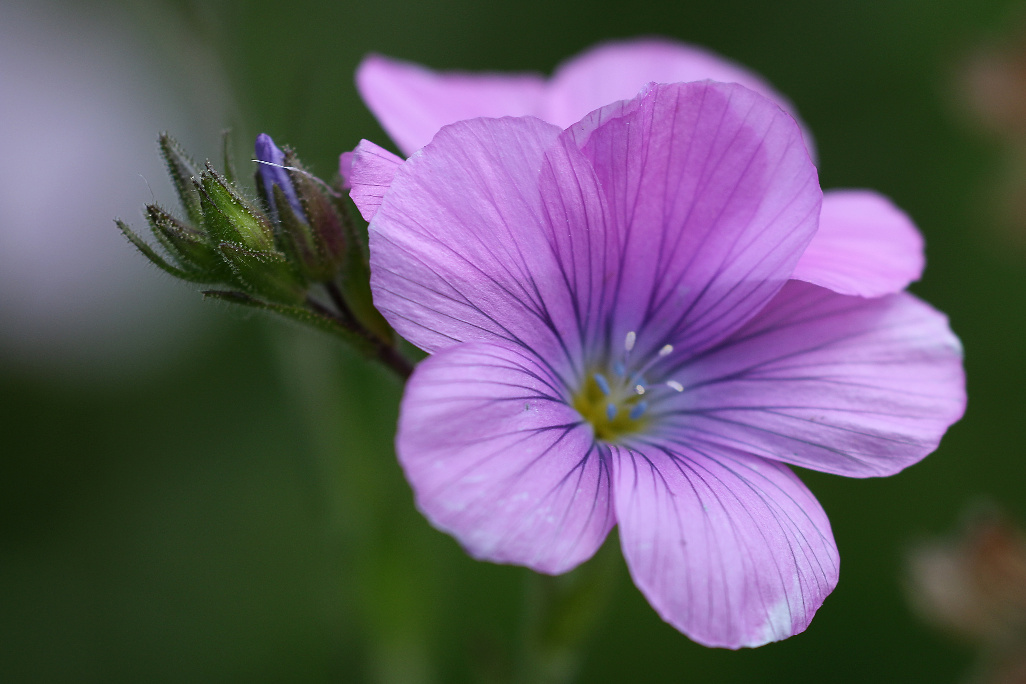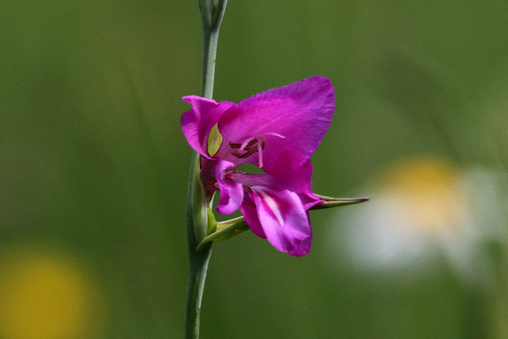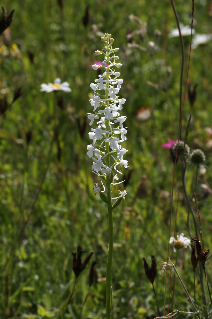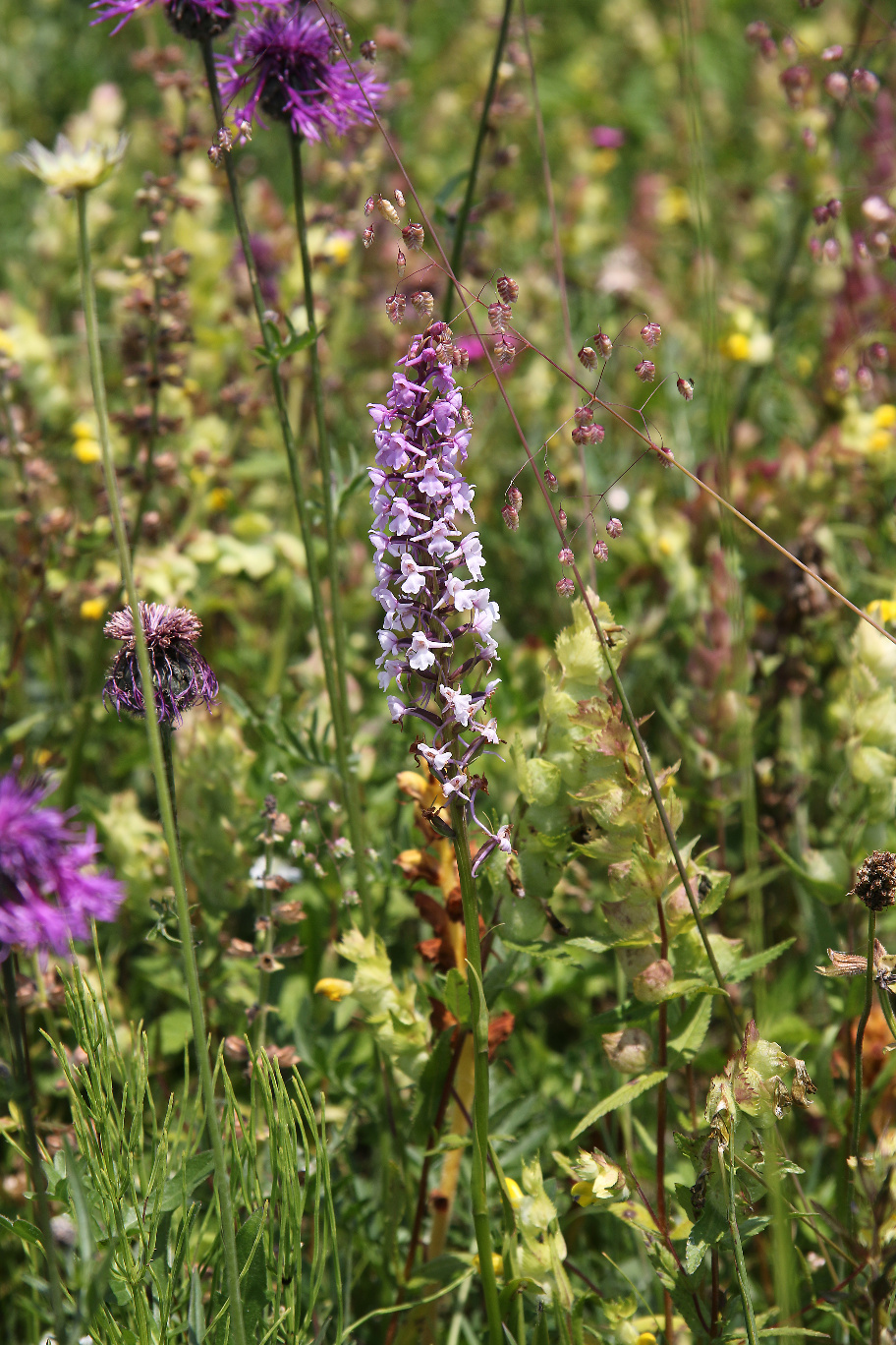 Überrascht hat uns der blaue Dauerlein (Linum perenne) und der klebrige Lein (Linum viscosum), der rosa blüht. Nicht zu übersehen ist das satte Gelb des Ochsenauges (Buphtalmum salicifolium, der Färberkamille (Anthemis tinctoria) und des Hornklees (Lotus corniculatus), während das Sonnenröschen (Helianthemum nummularium) erst in einzelnen Exemplaren zu finden ist. Besonders gefreut haben wir uns über die erfolgreiche Ansiedlung einer heimischen Orchidee, der großen Händelwurz (Gymnadenia conopsea), des Sumpfherzblattes (Parnassia palustris) sowie des Kreuzenzians (Gentiana cruciata) und des Deutschen Enzians (Gentianella germanica), der im Herbst blüht. Die Taubenskabiose (Scabiosa columbaria) sollte man nicht der Wiesenwitwenblume (Knautia arvensis) oder dem Teufelsabbiß (Succisa pratensis) verwechseln, obwohl alle in einem schönen Blau blühen. Die gelbe Skabiose (Scabiosa ochroleuca) hat sich schon gut verbreitet.